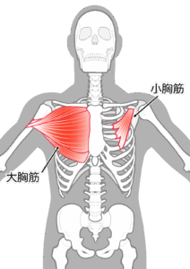 特に小胸筋が硬いと、前鋸筋がうまく働かず、肩甲骨が前方に引っ張られて巻き肩になります。